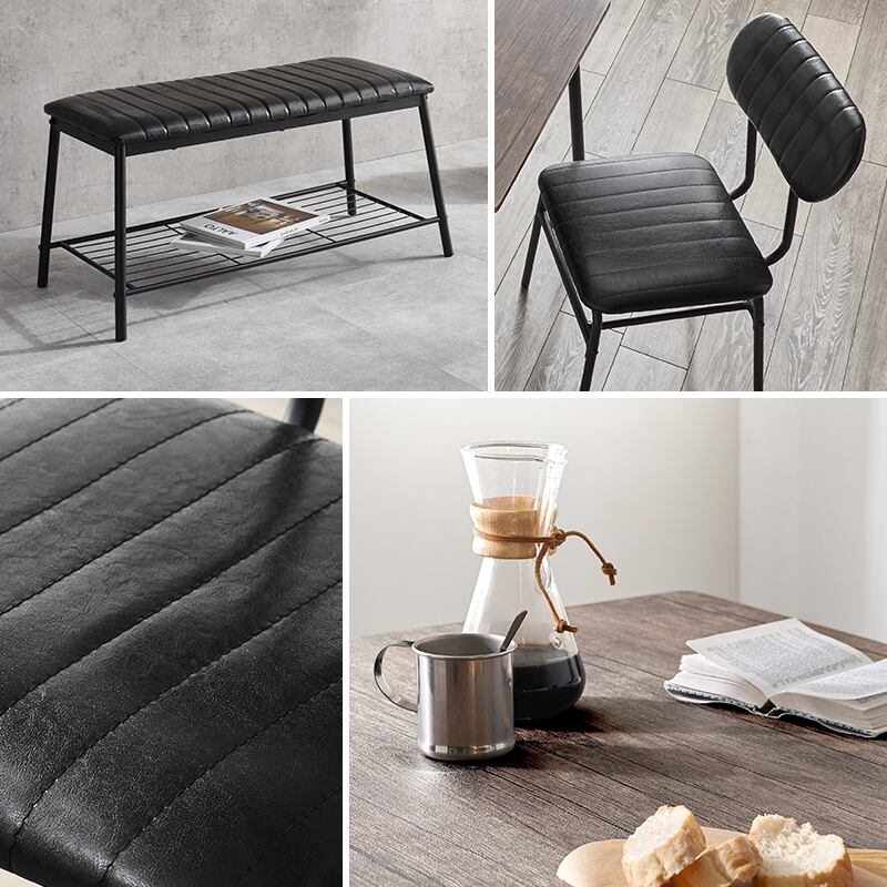 フレーム:スチール、天板:合成樹脂化粧繊維板(塩化ビニル)、チェア・ベンチ張地:合成皮革