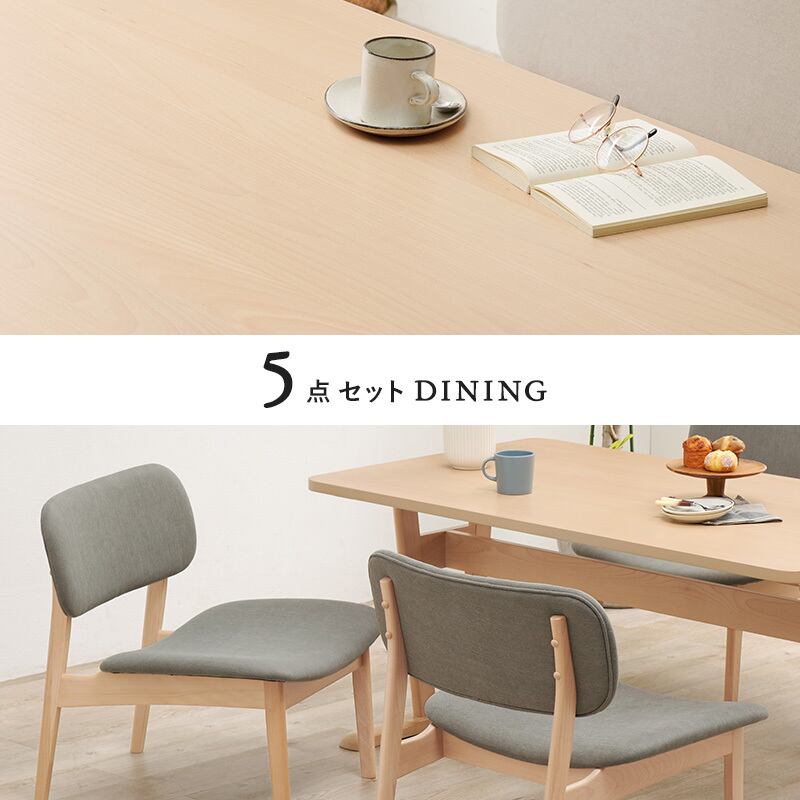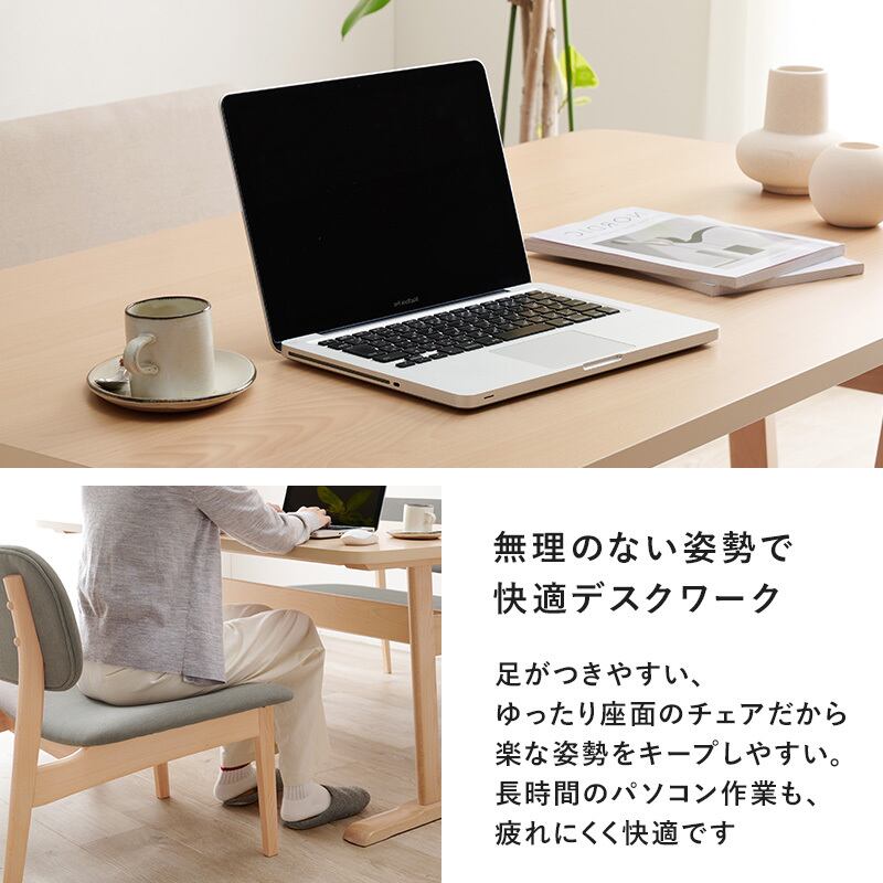 空間が広く感じられる低めのダイニングセット。なめらかな手触りの天然木を贅沢に使用しており、明るく繊細な木目を楽しめます。