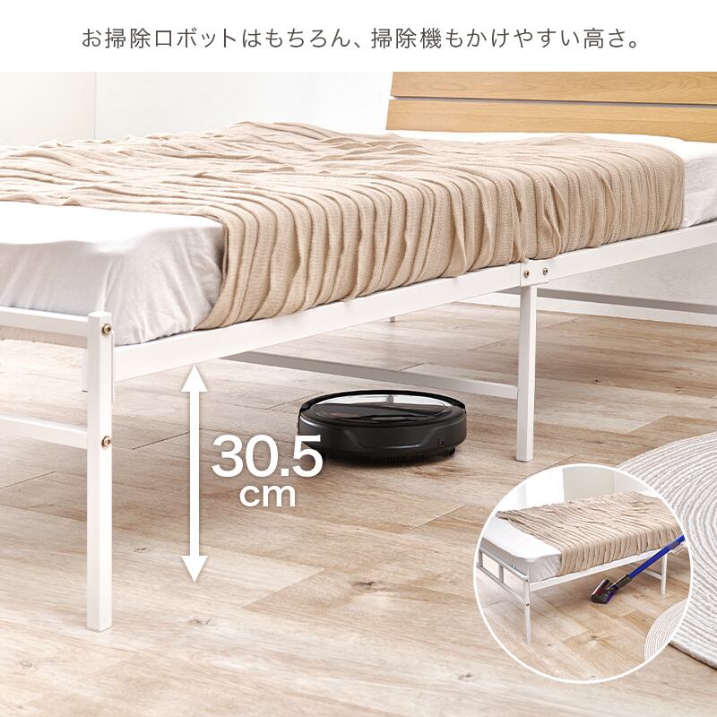 スチールフレームでスッキリとした印象のシングルベッド。ヘッドボードは木目調の傾斜があるパネル仕様です。安定感のある寝心地のボンネルコイルマットレスセット
