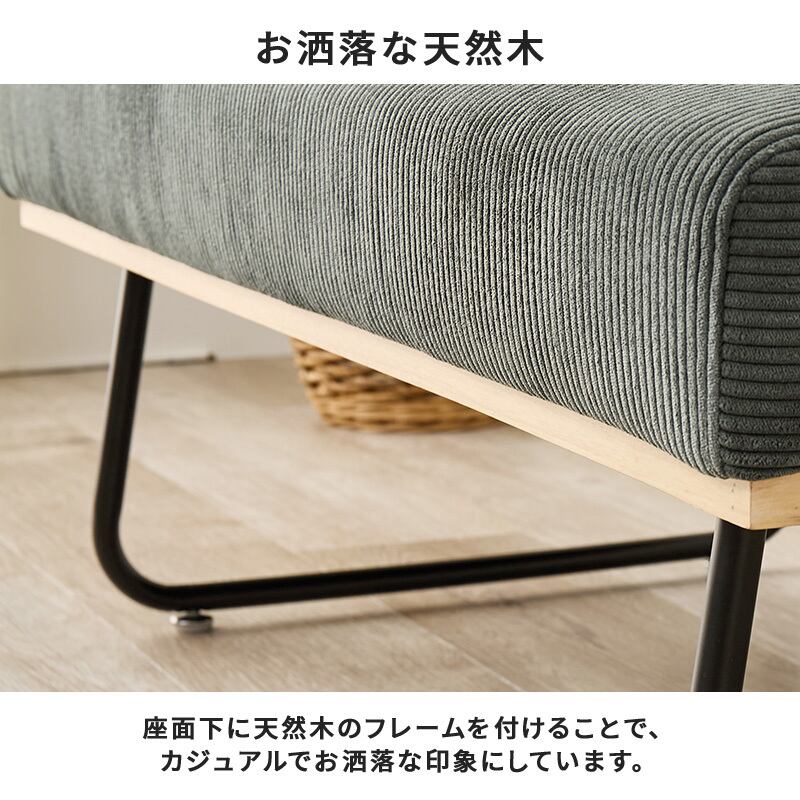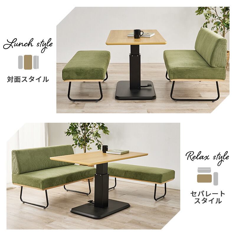 コーデュロイ生地のおしゃれなソファを合わせたダイニングセット。座面はやや低めで圧迫感を与えづらく、テーブルの天板は体格に合わせて無段階に昇降できます。