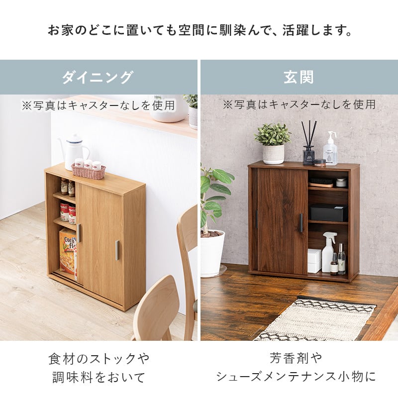 引き戸タイプなので省スペース。大きめのペーパーロールも入る収納棚は高さを変えてアレンジ可能。お掃除しやすいキャスター付き。