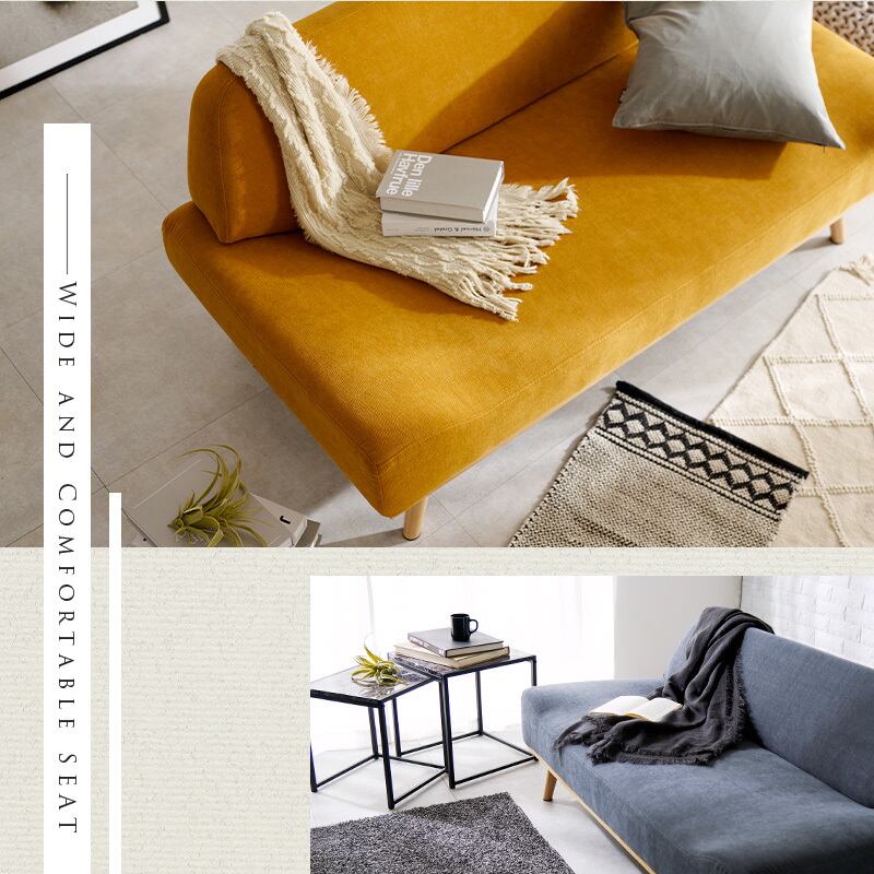 空間に圧迫感を与えないローデザインの二人掛けソファ。肘掛けを無くしたすっきりとした印象で、ゆったり広々座れます。