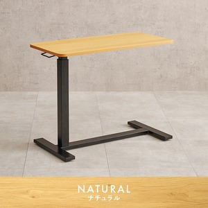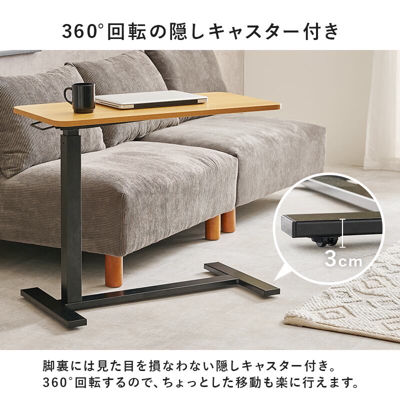 ガス圧式で無段階に高さ調節ができる昇降テーブル。キャスター付きで移動がしやすく、ソファやベッドに座って作業するときも脚が邪魔にならないデザインです