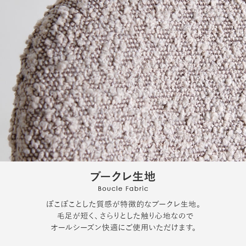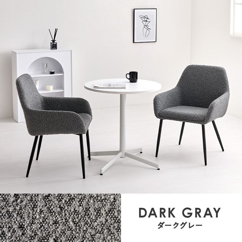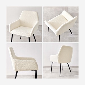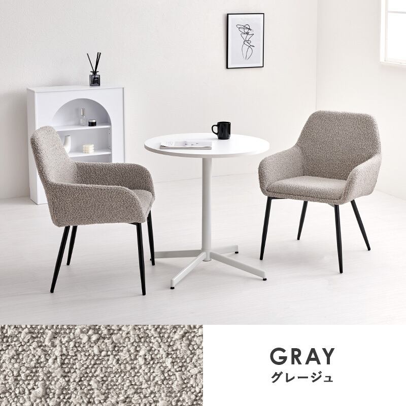 ぽこぽことした質感が特徴的なブークレ生地のチェアとホワイトカフェテーブルを合わせた、モダンでありながら温かみのある雰囲気の3点セット。