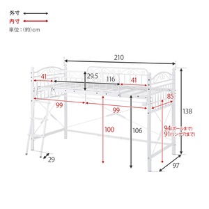 まるでプリンセスが住むお城のようなエレガントなデザインのパイプロフトベッドです。市販のカーテンを取り付けて使え、小物などの収納スペースも確保できるロータイプ