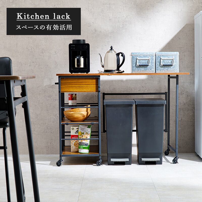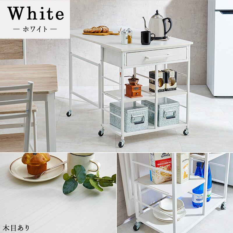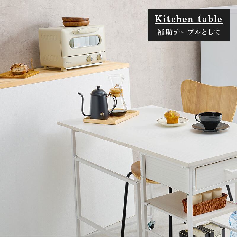 バタフライ天板を広げれば作業スペースを拡張できるキッチンワゴン。カトラリーなどを収納できる引出付き。