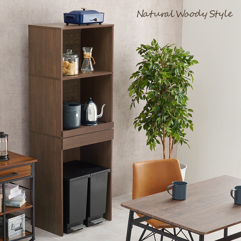 出し入れしやすいオープンタイプの多機能収納でキッチンスペースを有効活用可能。引出しやスライド棚付きでキッチン家電も使いやすい。