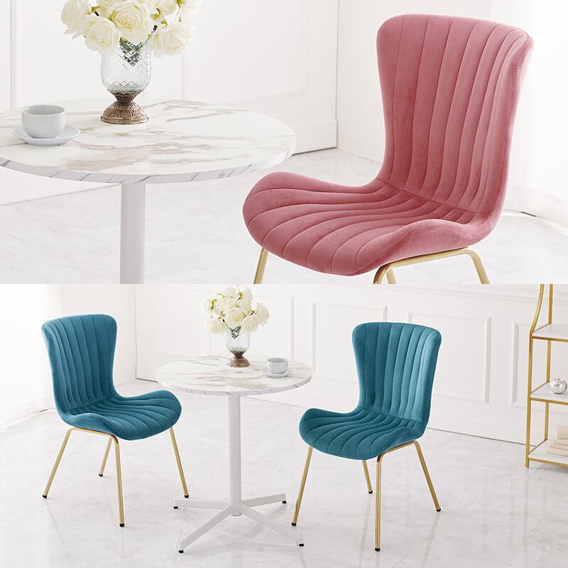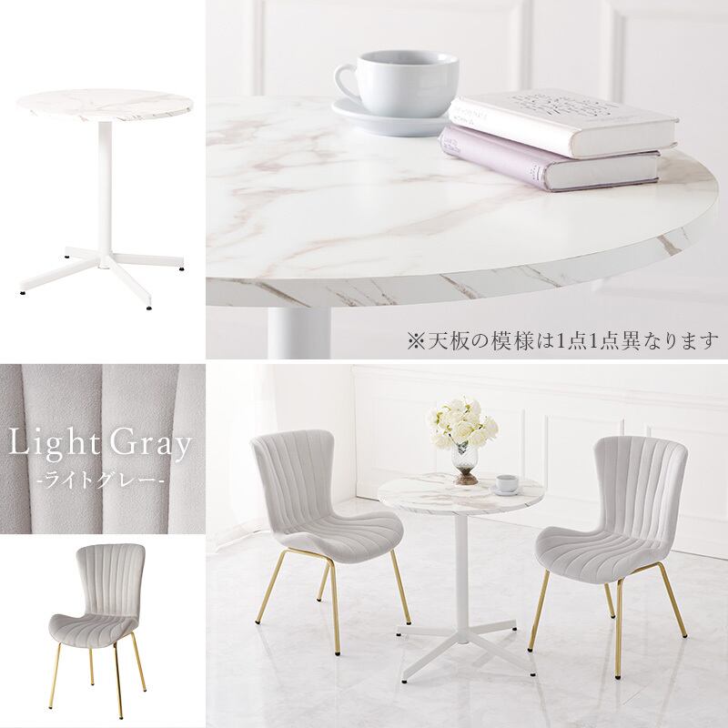 ベロア調生地のチェアと、リアルな大理石調天板のカフェテーブルを合わせた上品で大人かわいい3点セット。