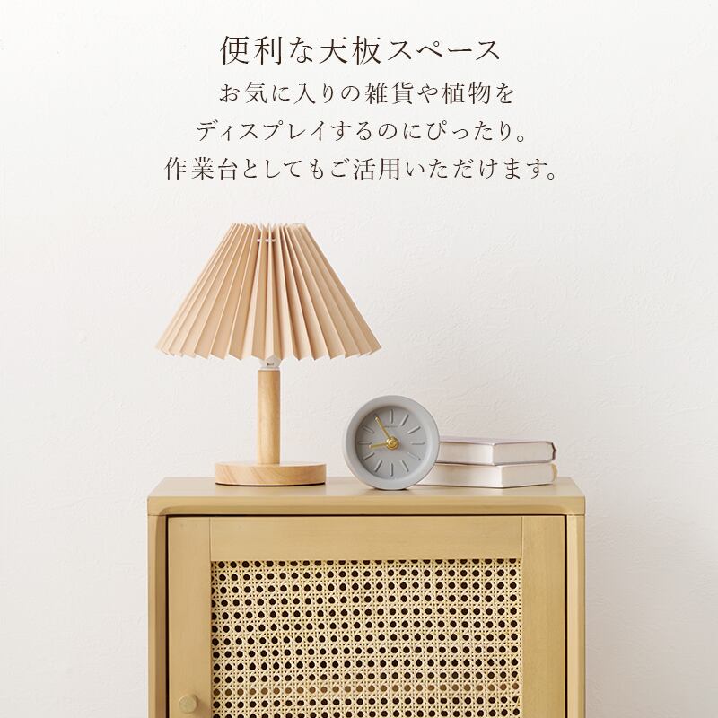 天然素材のラタンでかごめ編みを施した扉が、木のぬくもりに馴染みながら透け感を演出します。