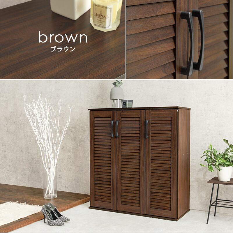 通気性が良いルーバー扉と背面の通気口で湿気や臭いがこもりにくいシューズラック。傘や杖などの収納もでき玄関がスッキリ片付きます。