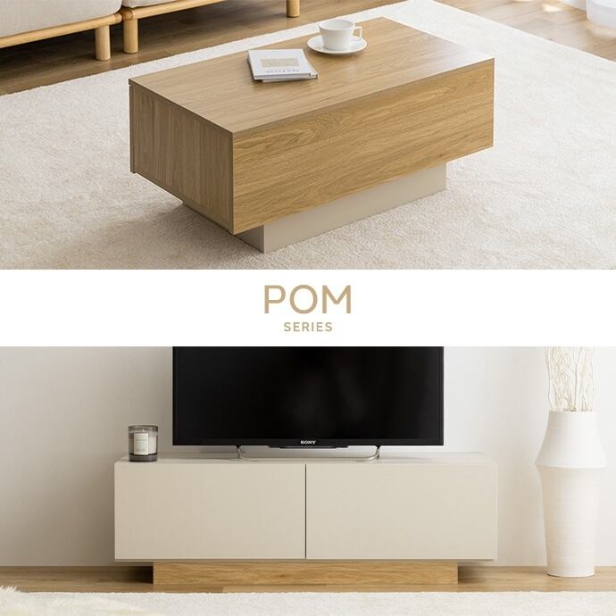 バイカラーの配色が特徴的な『Pom』引き出し付きテレビ台。ノイズレスでフロート脚のデザインは、置くだけでアクセントとなり、洗練された空間へと導きます。また引き出し収納や扉収納、吹き抜け収納を設置し、大容量収納ができるのでテレビ周りもすっきり。さらに壁付けで配置できるのに配線もすっきり通すことのできる設計に仕上げました。シンプルなのにこだわりの詰まったデザインと実用性を兼ねそろえたテレビ台です。