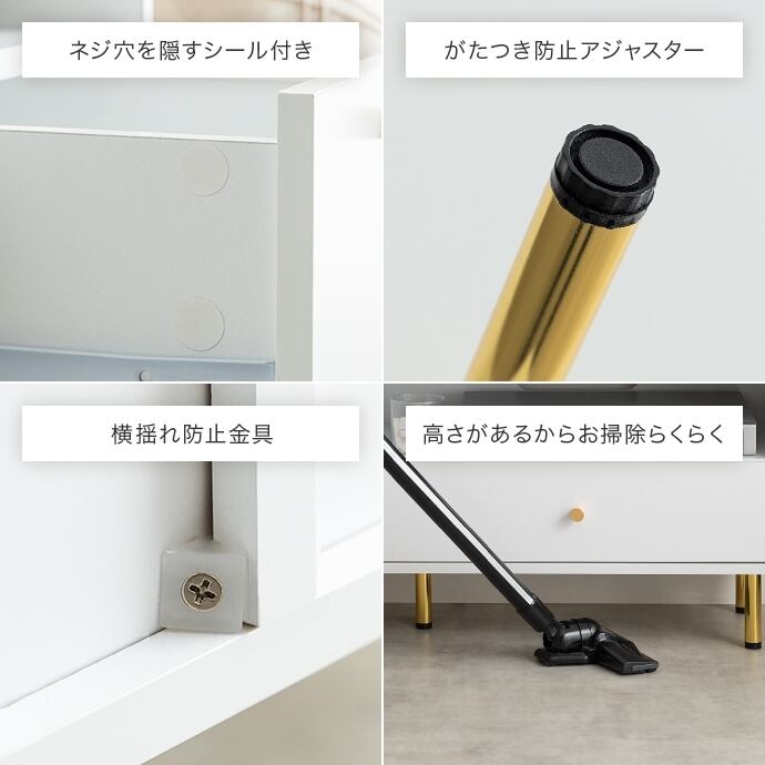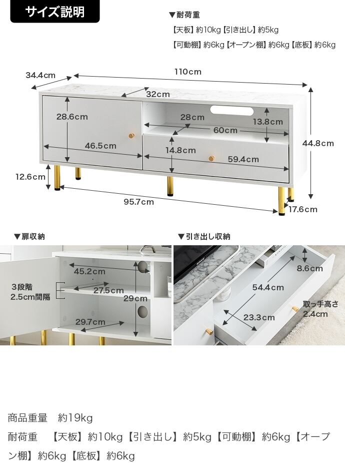 【耐荷重】天板:約10kg、引き出し:約5kg、可動棚:約6kg、オープン棚:約6kg、底板:約6kg