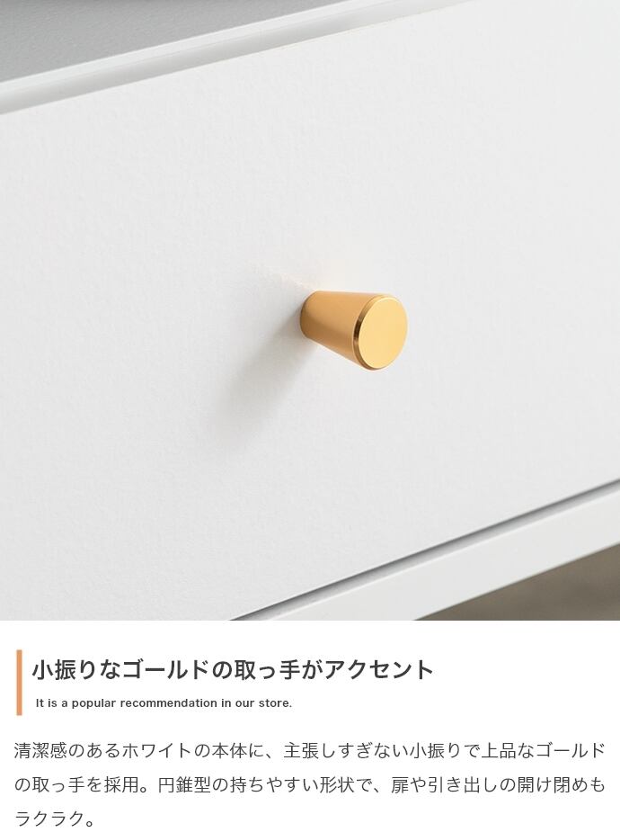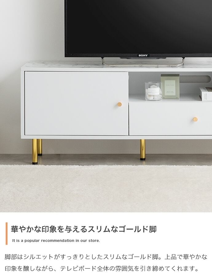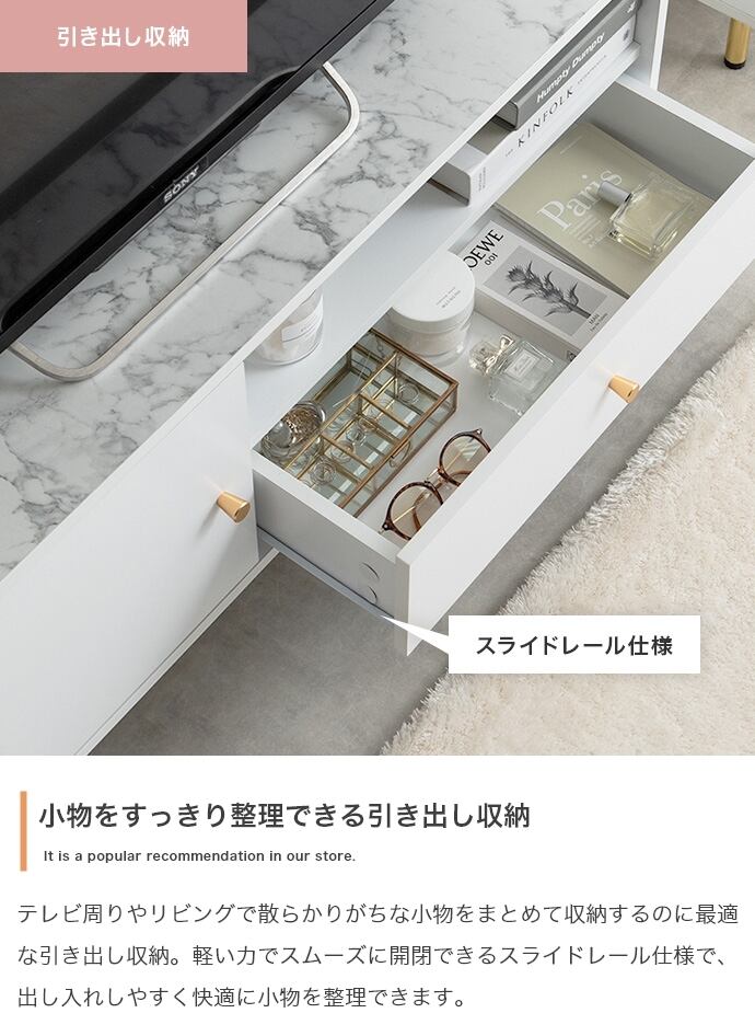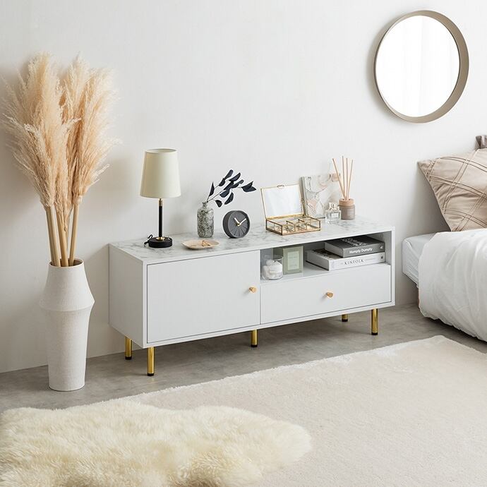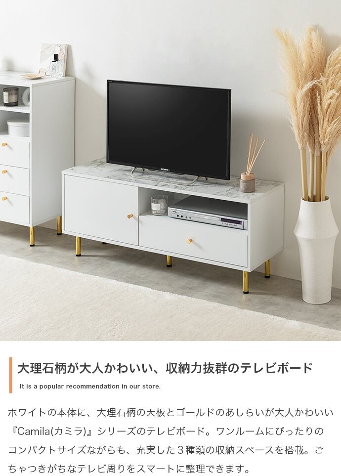 天板の大理石柄とゴールドのあしらいが特徴の『Camila(カミラ)』シリーズの引き出し付きテレビボード。大人かわいいデザインの本体とスタイリッシュなゴールド脚付きで、置くだけでお部屋の雰囲気を高めてくれます。3つの収納スペースと背面のケーブル穴で、ごちゃつきがちなテレビ周りもスマートに整理でき、生活感がなく美しい空間を実現可能。幅110cmとコンパクトサイズなので、一人暮らしやワンルームなど限られたスペースにもすっきり置いていただけます。