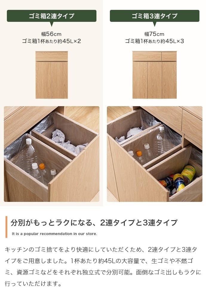 ゴミ箱に見えないデザインでお部屋に馴染む『Basurero(バスレーロ)』ゴミ箱付きキッチンカウンター。生活感を隠しながらもゴミ箱1杯あたり45Lゴミ袋が入る大容量で、使いやすく分別ラクラク。さらに面倒なゴミ出しをより快適にするため、2連タイプと3連タイプの2種類をご用意しました。また、コードスリット付きの天板はちょっとした作業をしたりキッチン家電を置くのにもピッタリ。コンパクトなこだわりのサイズ感はゴミ箱上ラックにも入り、理想のキッチン空間を作り出します。