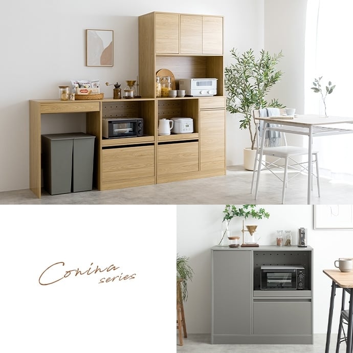 キッチン家電や食器・小物などをまとめて収納できる『Conina(コシーナ)』シリーズの食器棚。大容量の収納スペースにはたっぷりお皿やお鍋を収納でき、キッチン周りの様々なものをこの1台にまとめて収納していただけます。また、ノイズレスで凹凸がないため、エプロンの紐なども引っ掛かることを軽減する、キッチンに適しながらも上品で洗練された雰囲気を演出するデザインに仕上げました。
