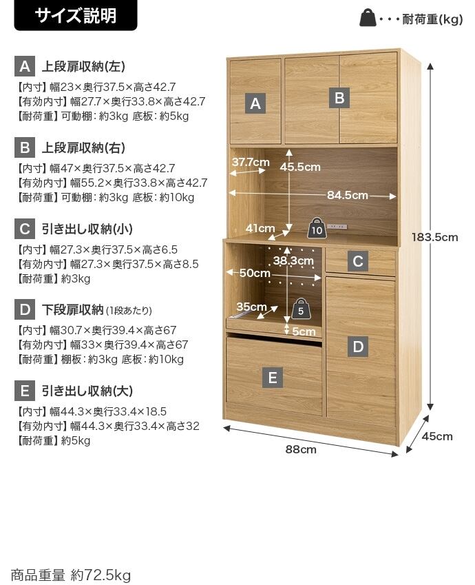 【耐荷重】オープン収納:約10kg、スライドトレー:約5kg、上段左扉収納・可動棚:約3kg、上段左扉収納・底板:約5kg、上段右扉収納・可動棚:約3kg、上段右扉収納・底板:約10kg、下段扉収納・棚板:約3kg、下段扉収納・底板:約10kg、引き出し収納(小):約3kg、引き出し収納(大):約5kg
