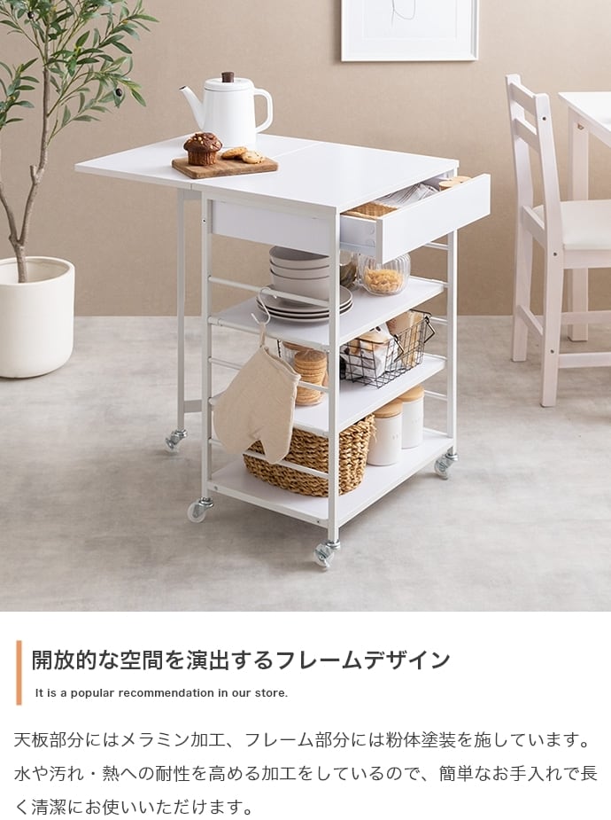 コンパクトなフォルムで機能性抜群の『Cammy(キャミー)』伸縮式キッチンワゴン。天板をぱっと広げるだけで作業スペースを拡張でき、ワゴンながら作業台にもなる優れものです。天板を使わないときは折りたたんでコンパクトに。お部屋の空いたスペースに置くことができるので、手狭に感じる部屋でも圧迫感なくお使いいただけます。また天板下についた収納は、ラックだけでなく引き出し付きとごちゃつく小物もまとめて収納が可能。たっぷり収納ができるワゴンはデザインもシンプルなので、ラックとしても使用可能です。