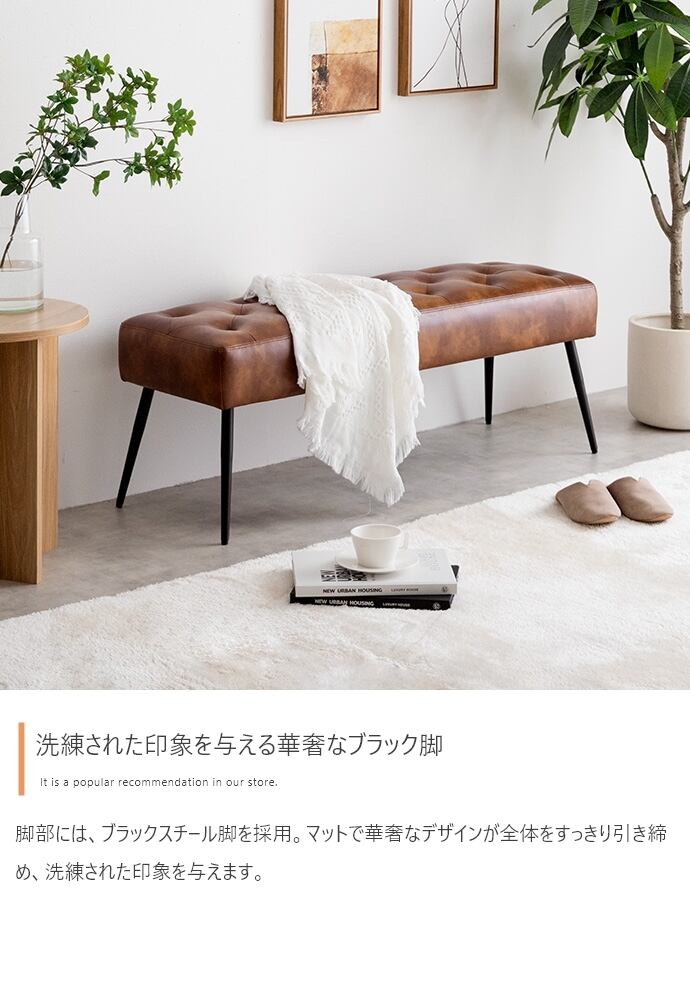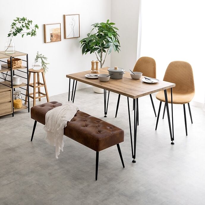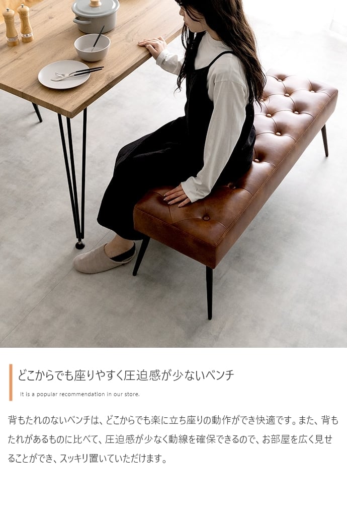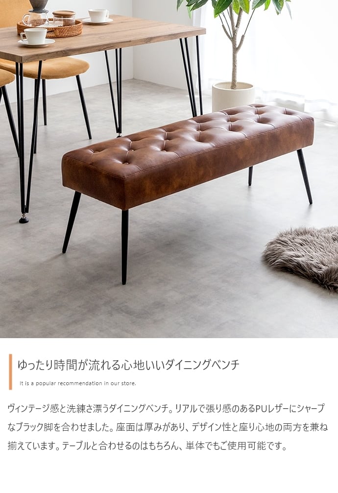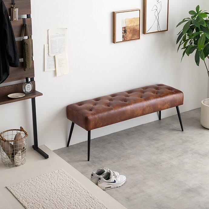 重厚感あるフォルムでヴィンテージ感漂う『Albie(アルビー)』ダイニングベンチ。美しいブラウjンのハリ感ある生地が大人の落ち着いた空間を演出します。また、厚みのある座面にはウレタンフォームを使用しており、座り心地も抜群です。さらに、ダイニングだけでなく、リビング、玄関など幅広いシーンでお使いいただけます。