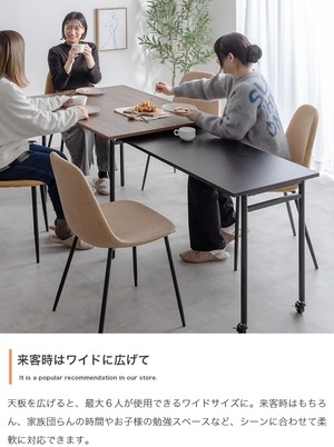 使う時だけ天板を広げられる『Libre(リーブル)』シリーズの伸縮スライド式ダイニングテーブル長方形。キャスター付き天板をスライドして引き出し、無段階での調整が可能。お部屋を広く使いたい時はコンパクトに、来客時などはワイドに使え、様々なシーンに合わせて活躍してくれます。天板には水や傷に強いメラミン加工を、脚には粉体塗装を施しているのでお手入れも簡単です。