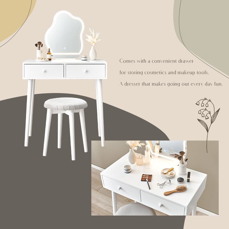 LEDの女優ライト付きのドレッサー。ホワイトのシンプルな本体に特徴的なウェーブミラーを合わせた大人可愛いデザインが魅力的。たっぷり収納ができて、一緒に使えるスツール付と使い勝手も優れています。