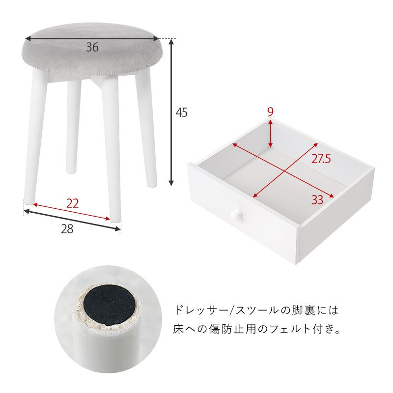 サイズ ドレッサー:(約)幅75×奥行48×高さ123.5cm、スツール:(約)幅36×奥行36×高さ45cm