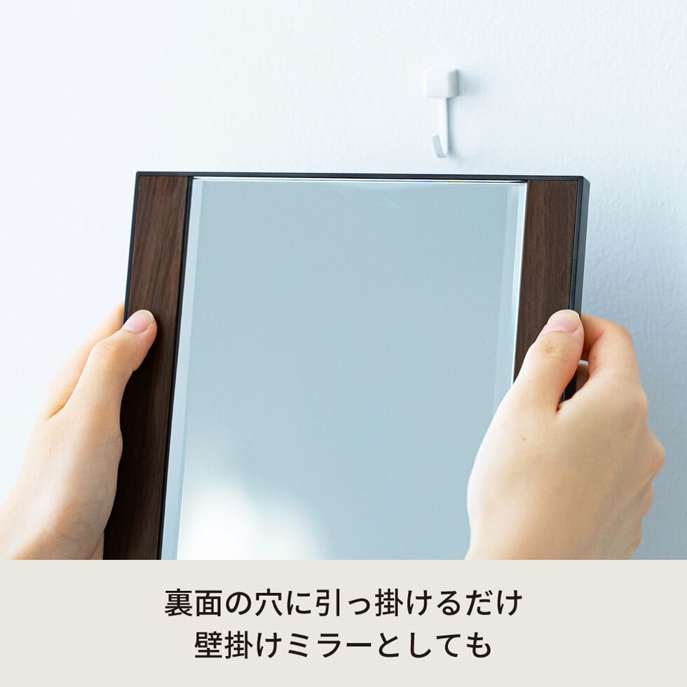 裏面には壁掛け用のフック穴がありウォールミラーとしても◎