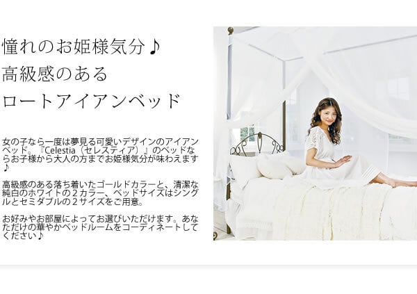 可愛いモノ好きなら一度は夢見る可愛いデザインのアイアンベッド。『Celestia(セレスティア)』のベッドならお子様から大人の方までお姫様気分が味わえます♪