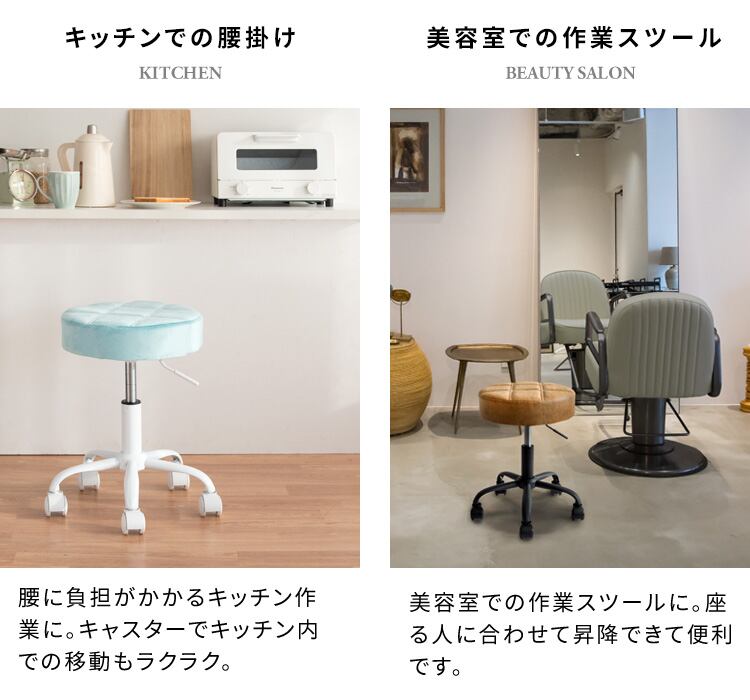 ダイニングやデスク、キッチンなどお家の色々な場所でお使いいただけます。エステサロンや美容室の作業用サロンスツールにも最適。
