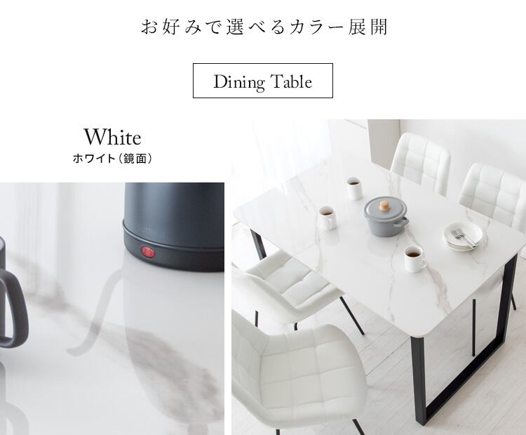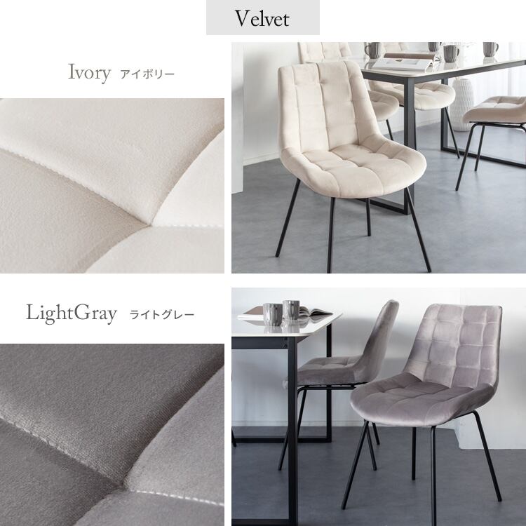 お好みで選べるカラーはテーブルが鏡面仕上げのホワイトとグレー、マットなダークグレーの3カラー、チェアはPUレザータイプがホワイトとダークグレー、ベルベットがアイボリーとライトグレーの計4カラーをご用意。テーブルとチェア4脚の5点セット、テーブル単体、チェア2脚の販売がございます。