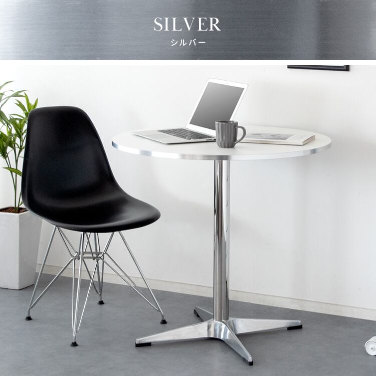 側面カラーがアクセントになるラウンド天板と、光沢の美しいシルバー脚がお部屋に映えるカフェテーブル『Caredo(カレド)』。