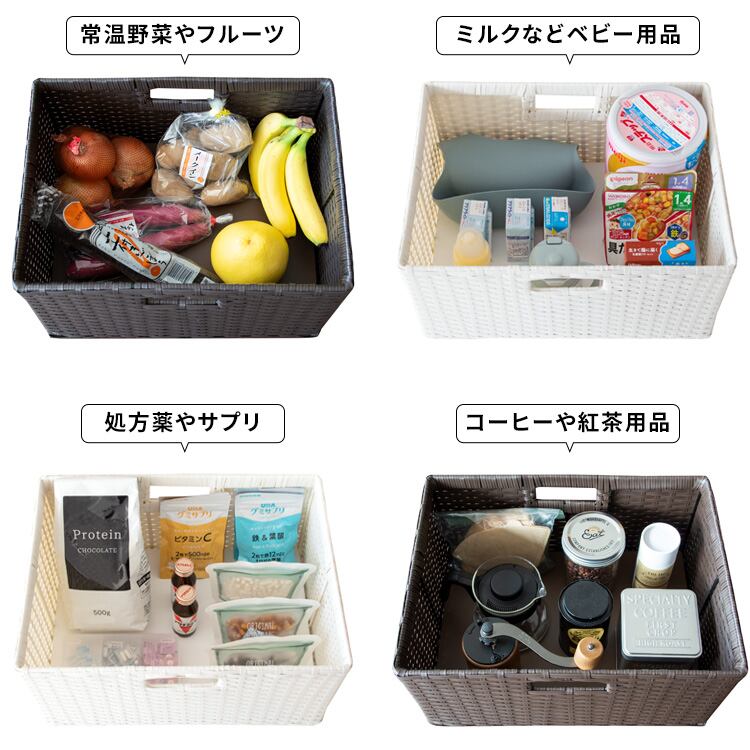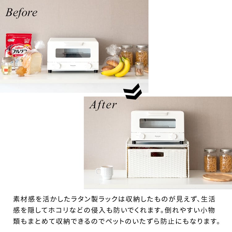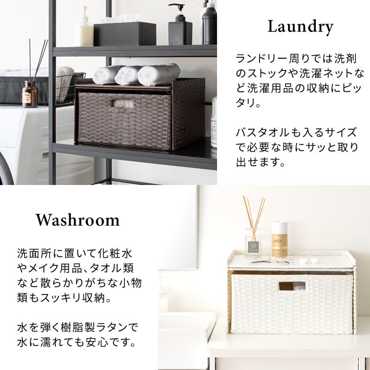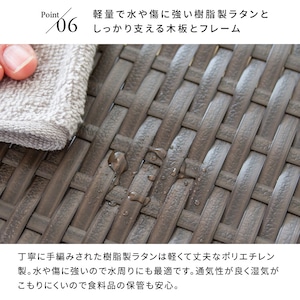 トースタも置ける天板でたっぷり収納できます。素材は水に強い丈夫な樹脂製ラタンで水周りでも安心。