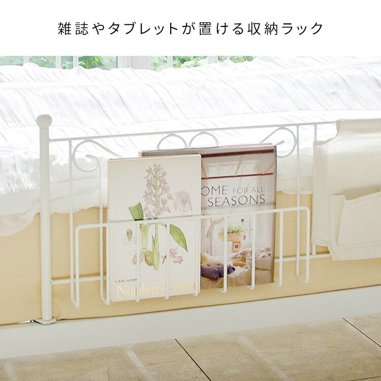 マットレスの下に差し込むだけの簡単取り付けで、布団のズレ落ちを防止します。雑誌や新聞が置ける収納ラックと、携帯電話やリモコンなど小物が入るポケットが三つある布カバー付きの便利なデザイン。