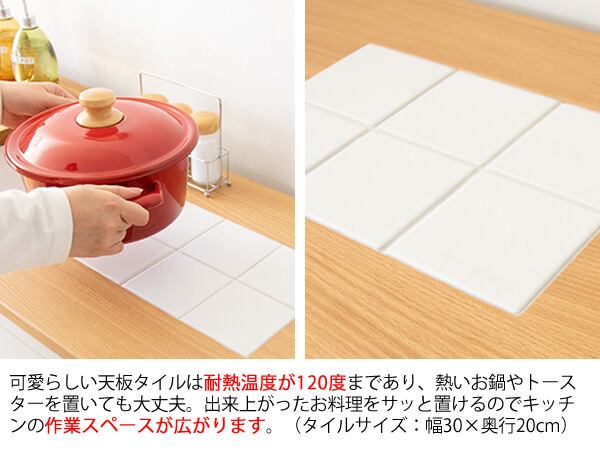 天板上にはタイルが敷かれており、熱いお鍋やトースターを置くことができとても便利。スライド棚やガラスが美しい開き扉もあり、たっぷり収納できます。キャスター付きでお掃除の時の移動も楽々。
