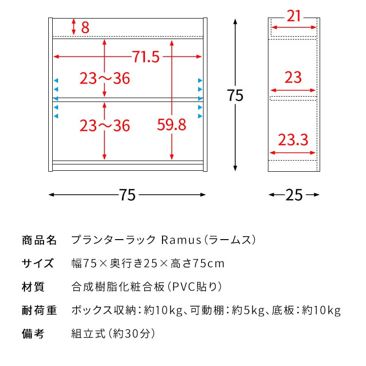 耐荷重 ボックス収納:約10kg、可動棚:約5kg、底板:約10kg