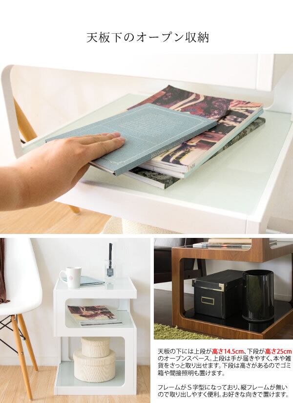 天板の下はガラス板のおしゃれなオープンスペースが2段あり、雑誌や新聞、高さのあるものも分けて収納できます。