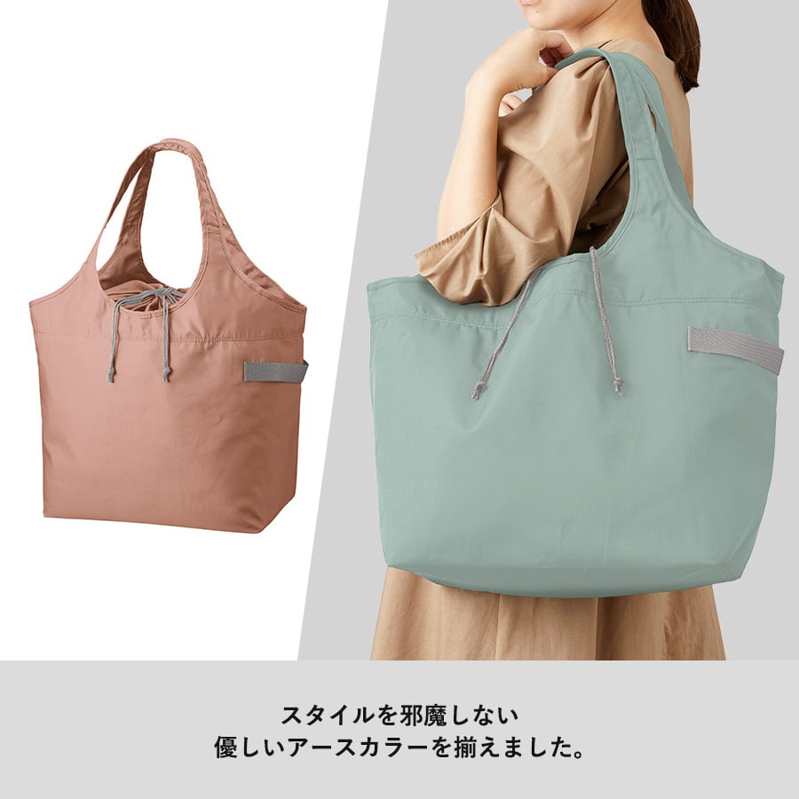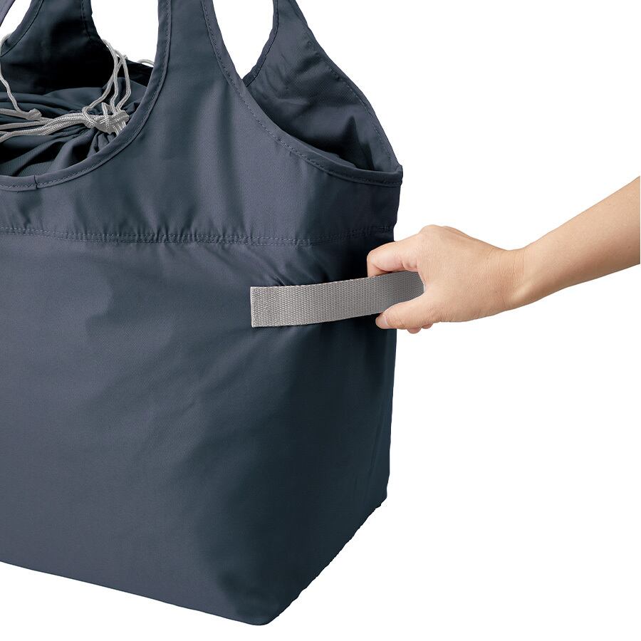 巾着仕様となっている口元は大きく開くことができるので物の出し入れがしやすく、外側についているベルトは車からの荷降ろしの際引っ張る事が出来るなど、機能性にこだわったお買い物バッグです。