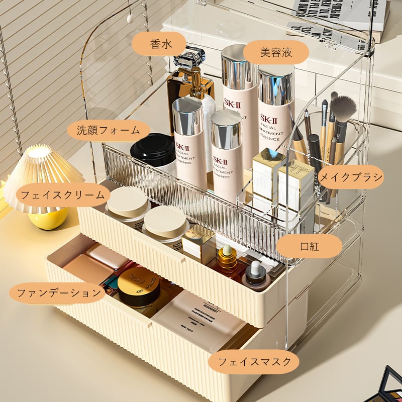 化粧水や乳液、パックなどのスキンケア用品から、メイク小物までまとめて整理整頓できます。