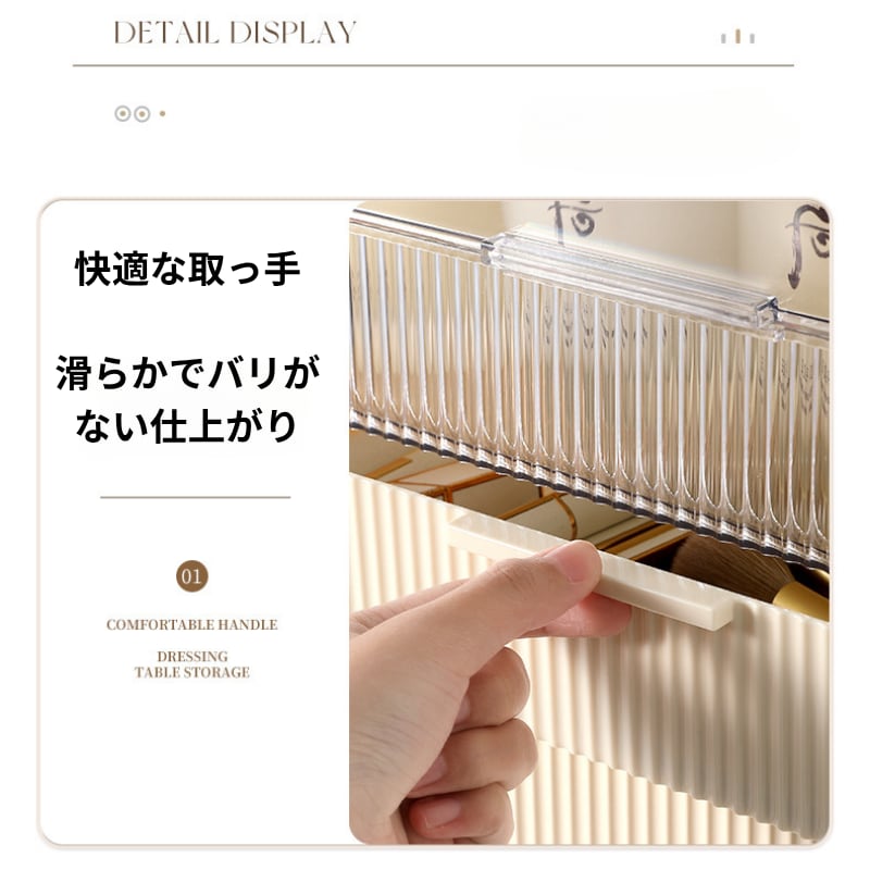 日々のコスメやスキンケア用品をまとめて美しく収納できる、3段引き出しタイプのコスメ収納ケースです。