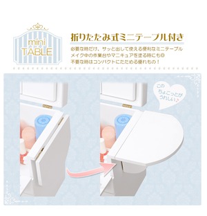 クリスタル型の取っ手が可愛い!三面鏡がついた大容量のコスメボックス。サイドにバタフライ式のミニテーブルも付いています。