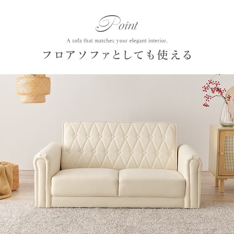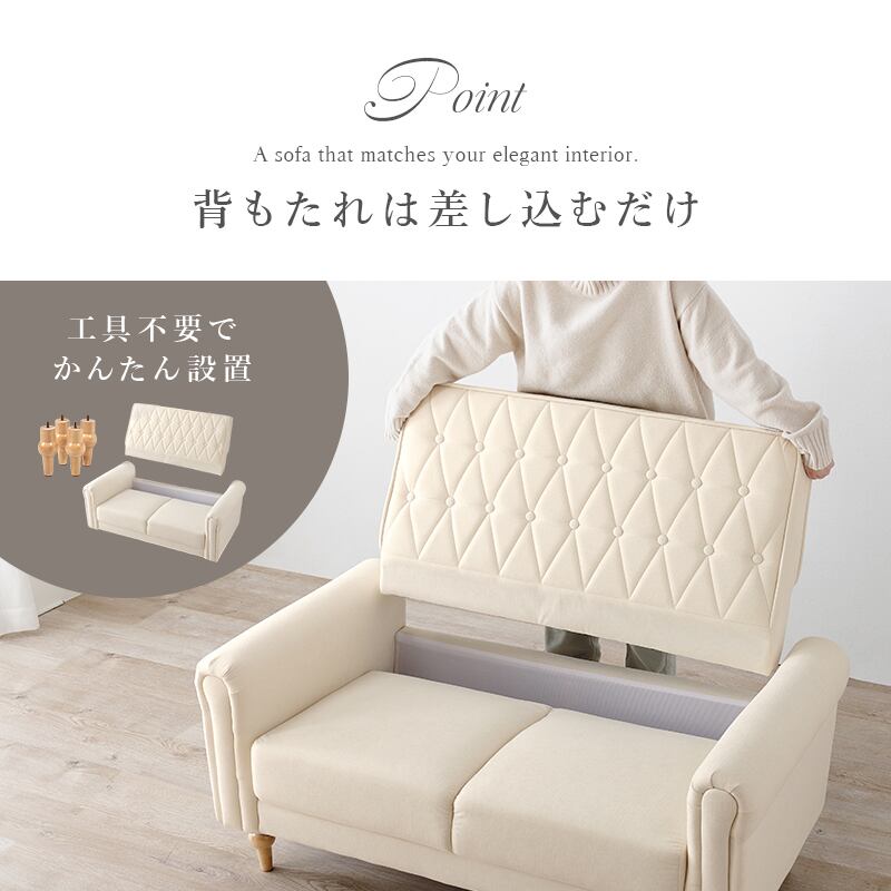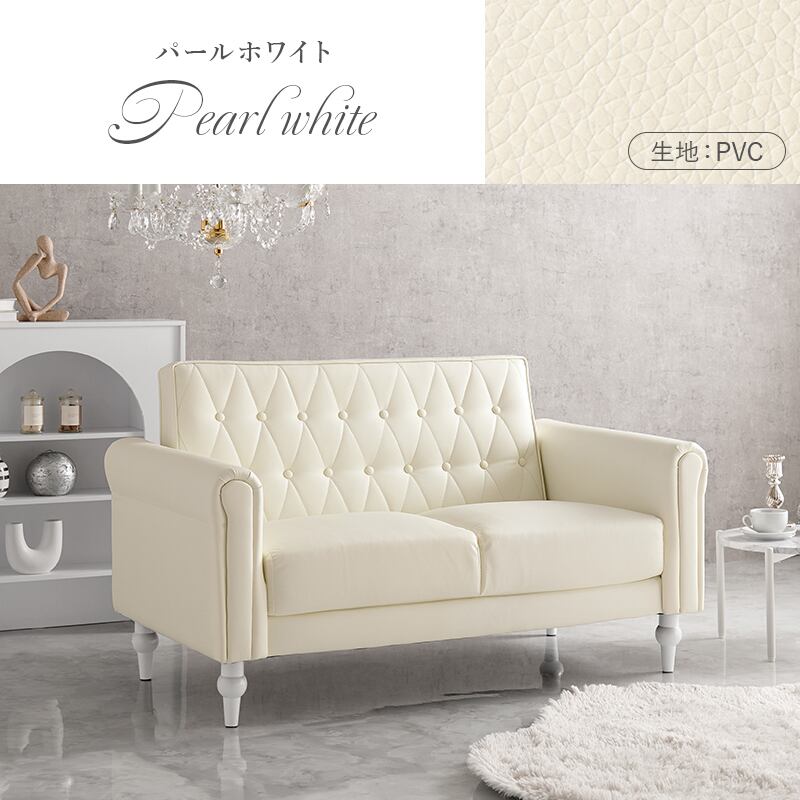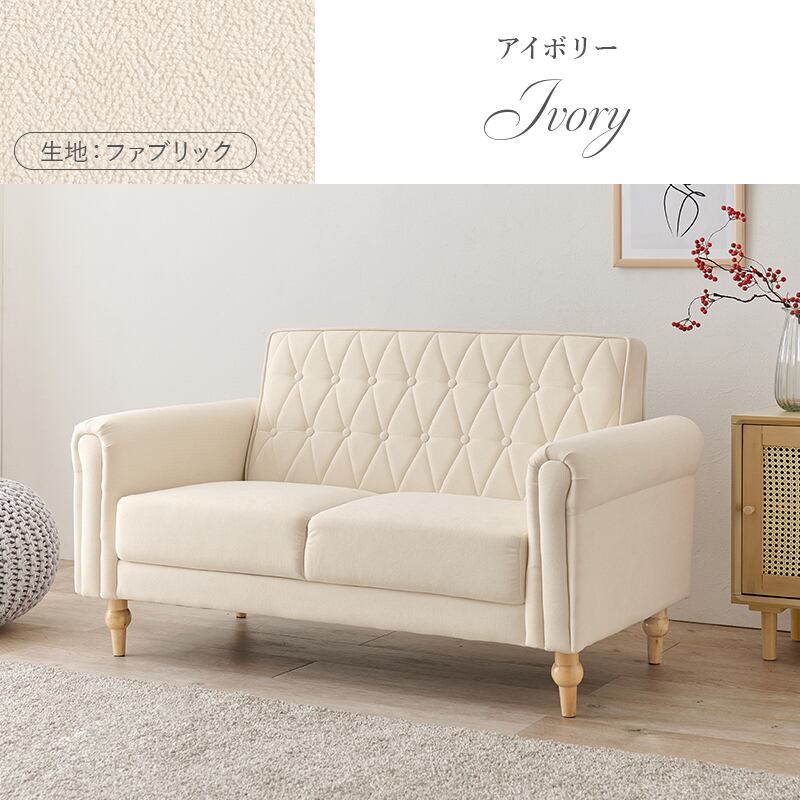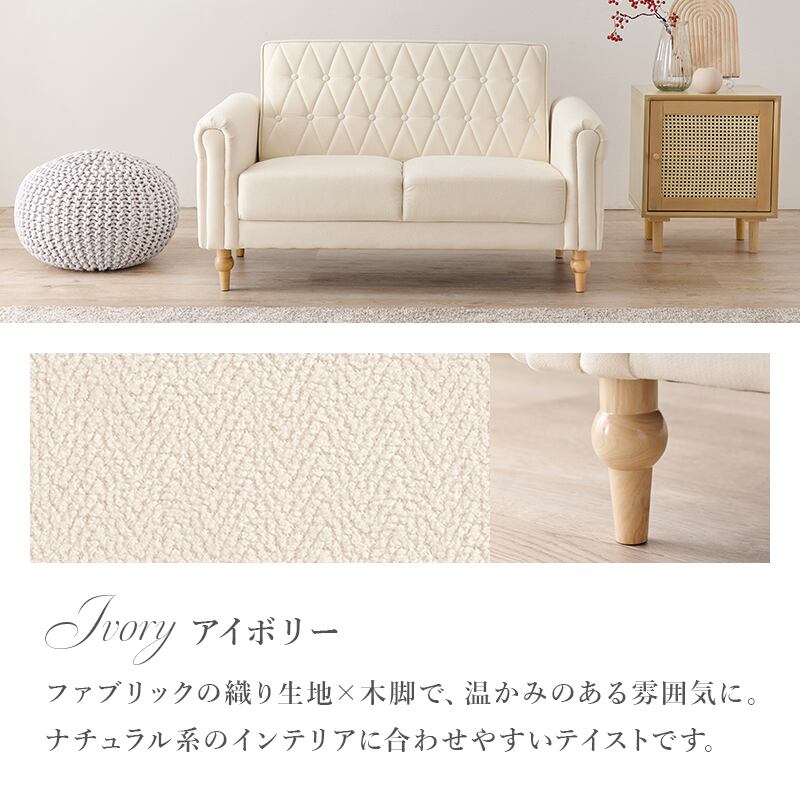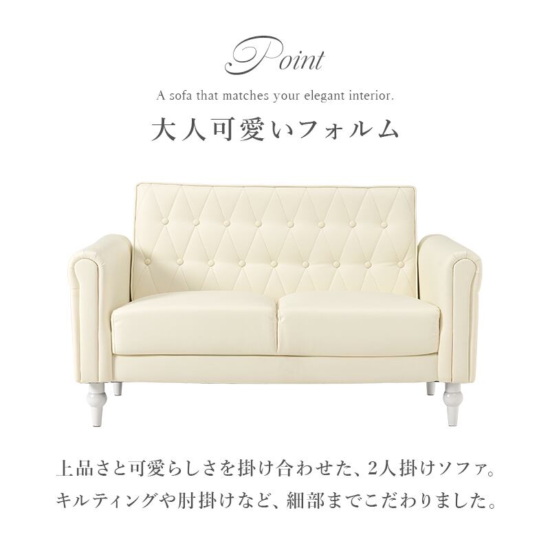 上品さと可愛らしさを掛け合わせた2人掛けソファ。背面のクロスボタンステッチや丸い肘掛けなど、こだわったデザインが魅力的