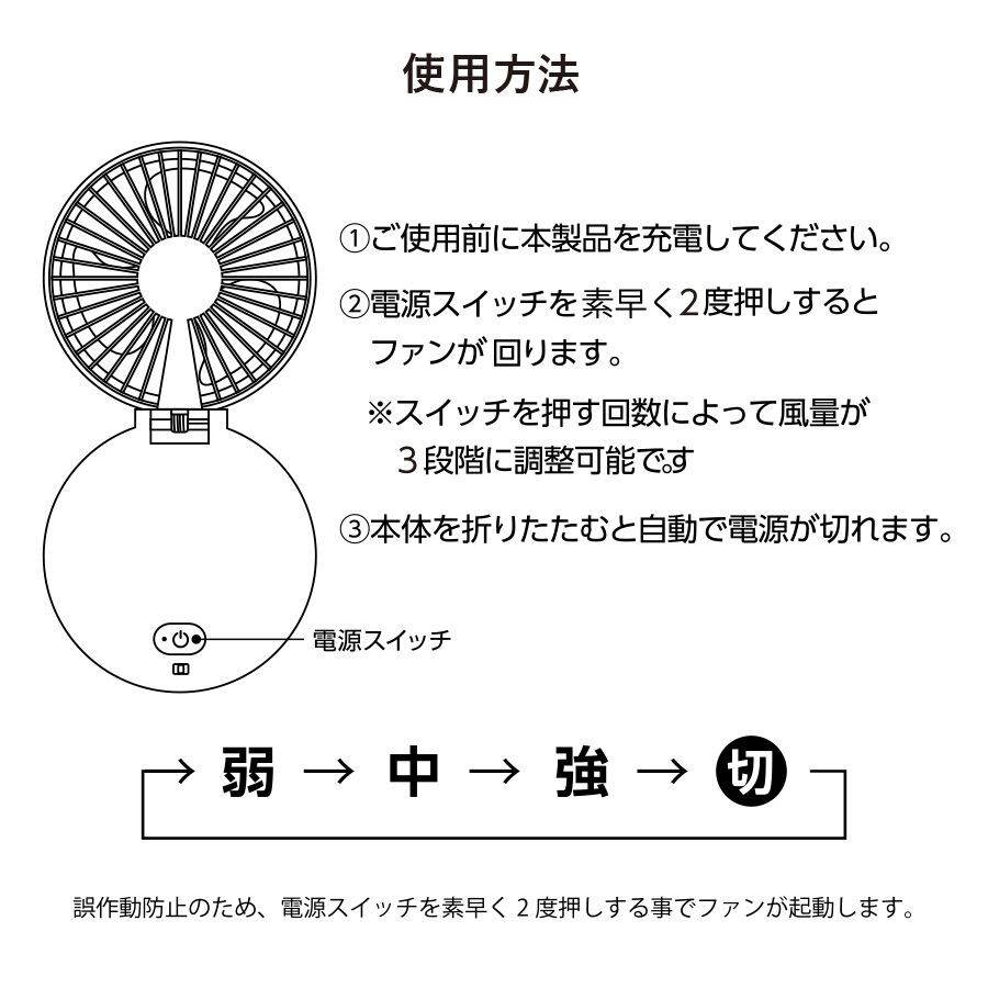 風量は弱・中・強の3段階となっており、オフィスや外出時など使用するシーンによって使い分けができます。