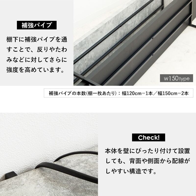 無骨でスタイリッシュなストーン調のTVボードが登場。細身のフレームを採用したミニマルなデザインが、洗練された空間を演出します。シンプルモダンなフォルムは、テレビ台としてだけでなく、センターテーブルやPCデスク、収納棚としても活躍します。安定試験実施済みの頑丈設計で、安心して使用できます。幅120cmと幅150cmの2サイズから選べます。