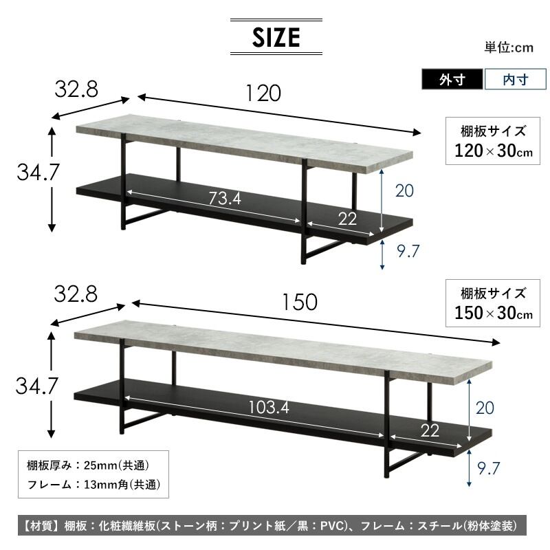 無骨でスタイリッシュなストーン調のTVボードが登場。細身のフレームを採用したミニマルなデザインが、洗練された空間を演出します。シンプルモダンなフォルムは、テレビ台としてだけでなく、センターテーブルやPCデスク、収納棚としても活躍します。安定試験実施済みの頑丈設計で、安心して使用できます。幅120cmと幅150cmの2サイズから選べます。