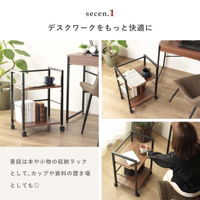 デスク横で仕事をサポートしたり、ソファ周りでサイドテーブルとして、ベッド脇ではナイトテーブル、ダイニングやキッチンで作業台としても活躍します。