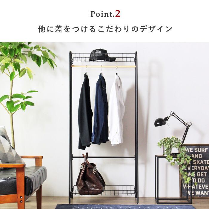 どこか懐かしい、ヴィンテージ感たっぷりのパイプハンガーラック「ガルボ」。シンプルなデザインながら、ざらついたフレームとワイヤー製の棚がヴィンテージ感を演出するこだわりの仕上がりです。天然木を使用したハンガーバーがデザインのアクセントとなっています。 5〜7着程度が収納できるハンガー部に加え、バッグや帽子などが収納できる棚も付いており、実用性も抜群。上質なデザインが日常をおしゃれに変化させてくれる、魅力的なハンガーラックです。