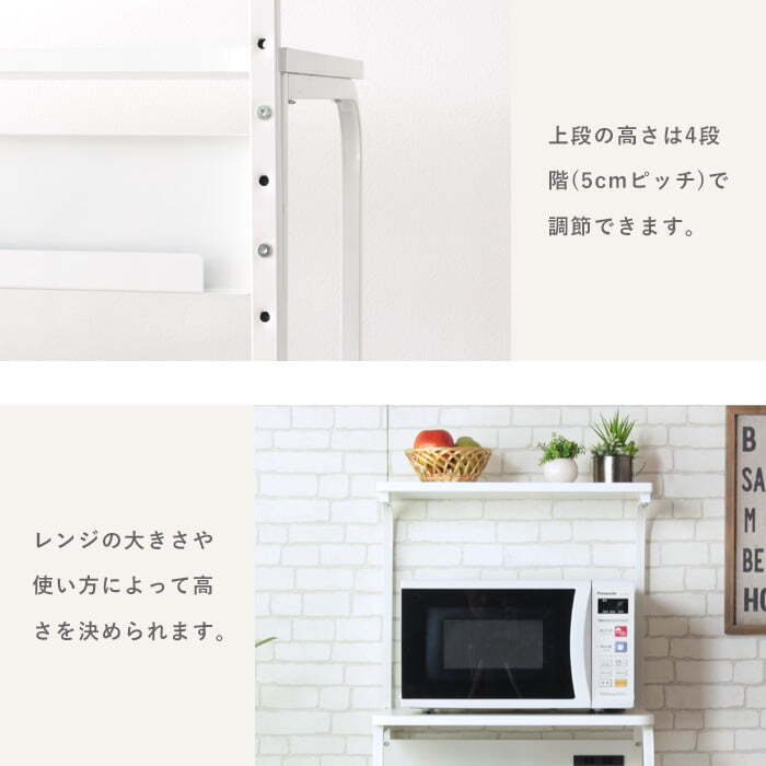 大型レンジにも対応したワイド&パワフルなレンジラック。全身ホワイトで清潔感のあるデザインが特徴で、シンプルかつ使いやすい設計です。スライド棚にはポットや炊飯器などの家電製品も収納可能。便利なコンセント付きで、電源を手近に確保できます。キャスター付きで移動や掃除もラクラク。キッチンをすっきり美しく保つことができます。