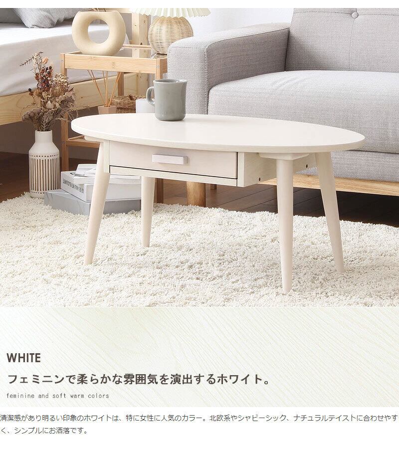 丸くて可愛い卵型の楕円形フォルムに、ぬくもりのある木の質感が空間を優しく包み込む、引き出し付きローテーブル・クライス。