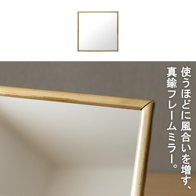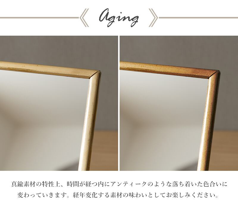 ゴールドとミラーの美しい組み合わせが特徴的な真鍮素材のフレームミラー。 スタイリッシュでありながら温かみのある光沢が、お部屋をワンランク上のムードに演出します。 身だしなみを整えるだけでなく、鏡は空間に奥行きを与え、部屋を広く見せる効果もあります。 インテリアのアクセントとして取り入れるのもおすすめ。 使用するごとに光沢や色味が深みを増し、経年変化を楽しむことができます。