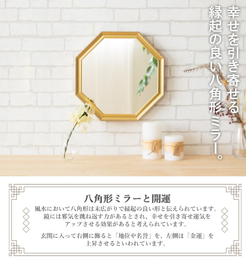 細やかな装飾が目を惹く、気品漂うアンティーク調の八角形フレームミラー。 ゴールドカラーがインテリアに華やかさを添え、光を取り込むことでお部屋を明るく広々と見せてくれます。 壁掛けと卓上の2通りの使い方が可能で、リビングや寝室、廊下、洗面など、どこにでも手軽に設置できます。 クラシカルなデザインと実用性を兼ね備えた一枚で、空間をより魅力的に演出します。