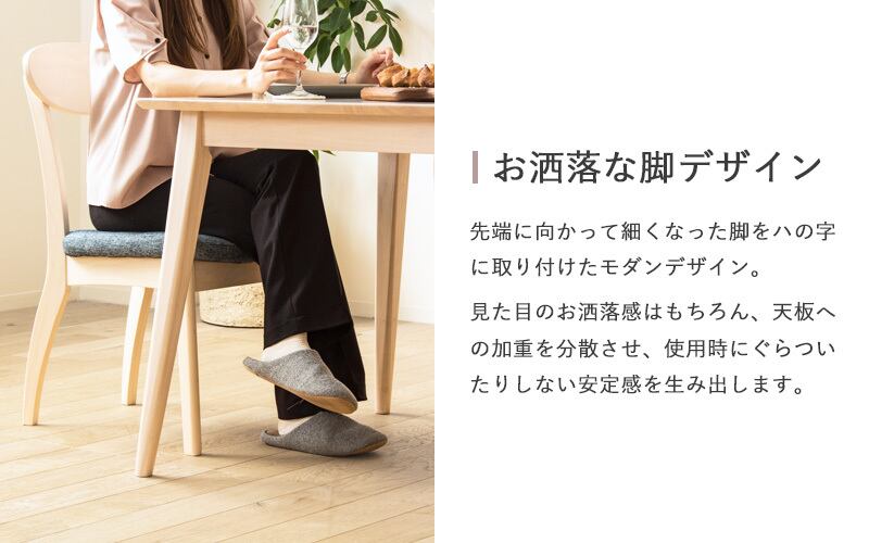シンプルで馴染みやすいデザインと、細かい部分までこだわった仕上げの高品質なダイニングシリーズ「スイーツ」。 天然木ラバーウッドをふんだんに使用しておりますが、木目の綺麗な質の良い材料を用い、 角部分の面取り加工や表面をウレタン樹脂塗装で仕上げることで、人に優しいなめらかな手触りを実現。 さらに化学物質などに敏感な方や、 小さなお子様がいらっしゃるご家庭でも安心の低ホルムアルデヒド家具で、シックハウス対策に配慮しています。 ※こちらはダイニングテーブル幅90cm(単体)の販売ページです。